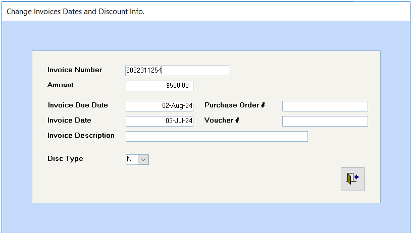 You may use this program to change three fields for unpaid invoices, namely Projected Pay Date, Invoice Date, or the Discount type. However, the primary use will be to change the Invoice Due Date. Changing the Due Date will affect the selection results in the Select Invoices to Pay program.