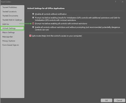 Office updates have also impacted ActiveX controls in Access. Spectra now scans and restores these settings automatically in the Trust Center.